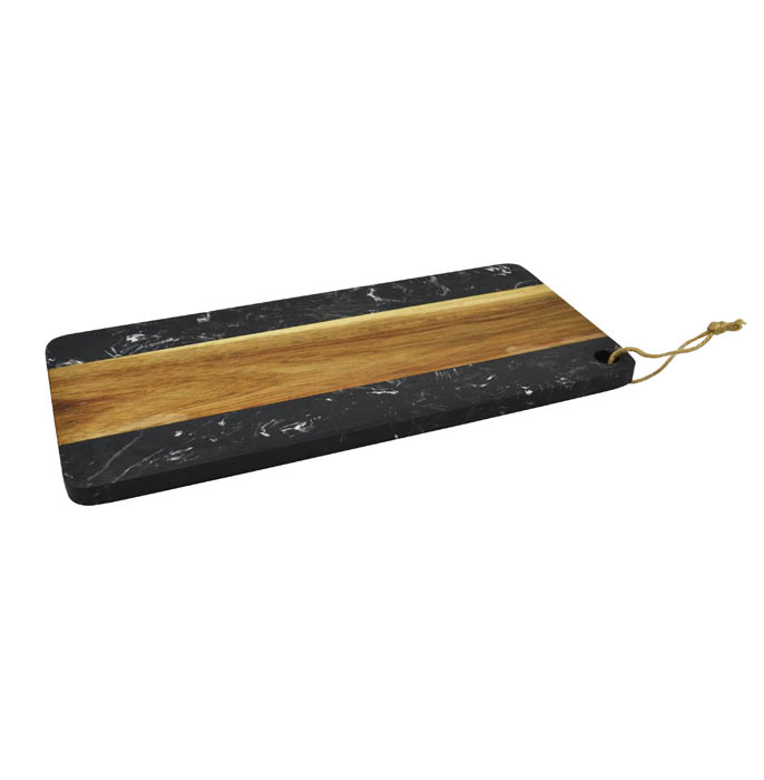 Επιφάνεια κοπής και σερβιρίσματος από μαύρο μάρμαρο και συνδυασμό από ξύλο ακακίας. Χρησιμοποιήστε το ως δίσκο κοπής και προετοιμασίας φαγητού, αλλά και για να σερβίρετε και να εντυπωσιάσετε τους καλεσμένους σας.