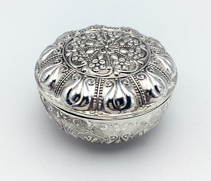 Μπιζουτιέρα επάργυρη στρογγυλή 3'', με ανάγλυφα σχέδια.