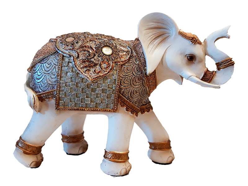 Ελέφαντας polyresin σαμπανί με ανάγλυφα χρυσά-ασημένια σχέδια, με διάσταση 18x17cm.