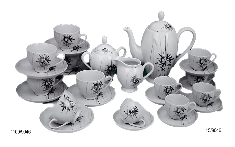 1109/9046: Φλυτζάνια τσαγιού πορσελάνης σετ 6 τεμαχίων με πιατάκια, σε λευκό χρώμα και διακοσμητικά μαύρα λουλούδια.15/9046: Σερβίτσιο τσαγιού 15 τεμαχίων από υψηλής ποιότητας πορσελάνης, σε λευκό χρώμα και διακοσμητικά μαύρα λουλούδια.Το σετ αποτελείται: 6 φλυτζάνια του τσαγιού, 6 πιατάκια,1 τσαγιέρα, 1 γαλατιέρα, 1 ζαχαριέρα.