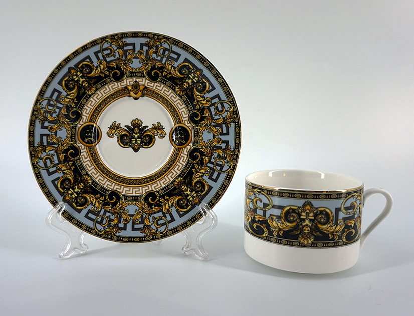 Φλυτζάνια τσαγιού - καφέ πορσελάνης σετ 6 τεμαχίων με πιατάκια, σε κλασικό μπαρόκ σχέδιο με μια πλούσια χρυσή-γαλάζια και λευκή απόχρωση.