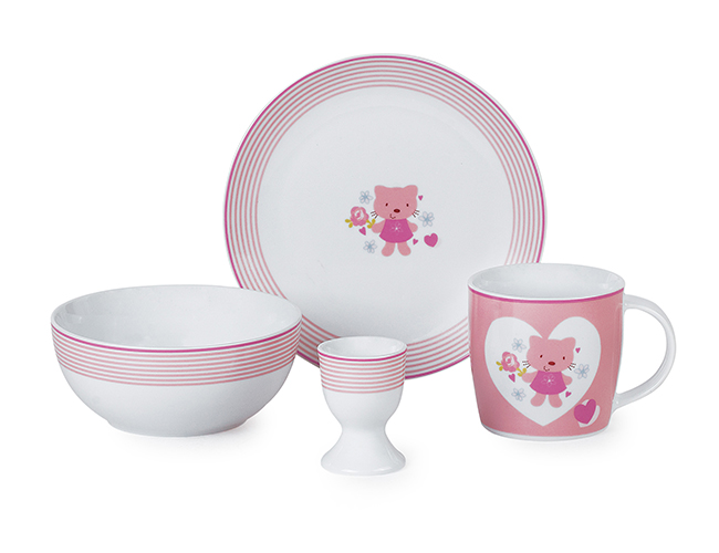Παιδικό σετ φαγητού 4 τεμαχίων από φίνα πορσελάνη. Το σετ αποτελείται από μια κούπα, ένα μπολ πολλαπλών χρήσεων, ένα πιάτο και μία αυγοθήκη.