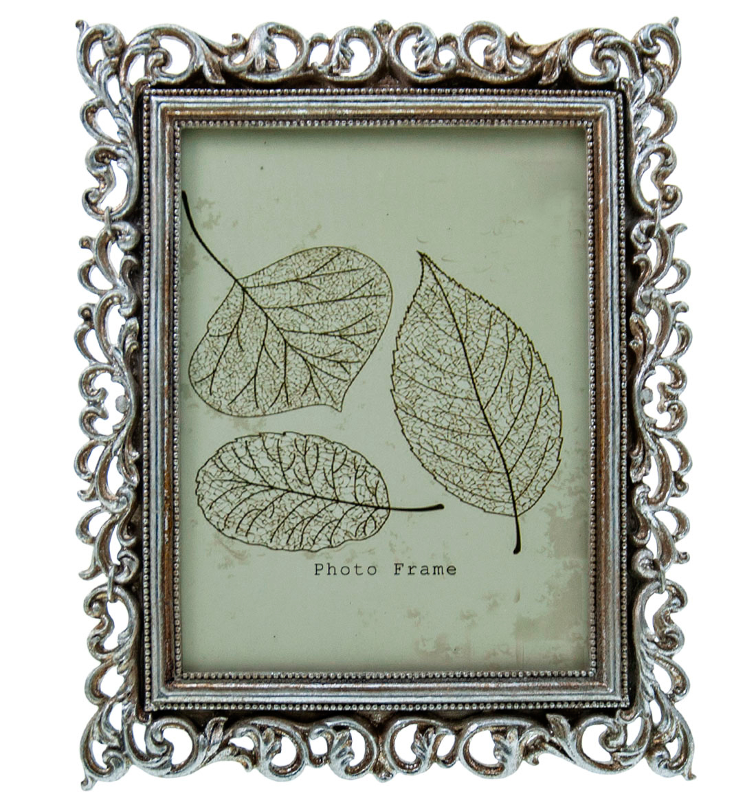 Κορνίζα από πολυεστέρα με σκαλιστό σχέδιο σε ασημί χρώμα και βελούδινη μαύρη πλάτη. Διαστάσεις φωτογραφίας 15×20 εκατοστά, με εξωτερικό πάχος κορνίζας 2 εκατοστά. Η κορνίζα τοποθετείται οριζόντια και κάθετα.