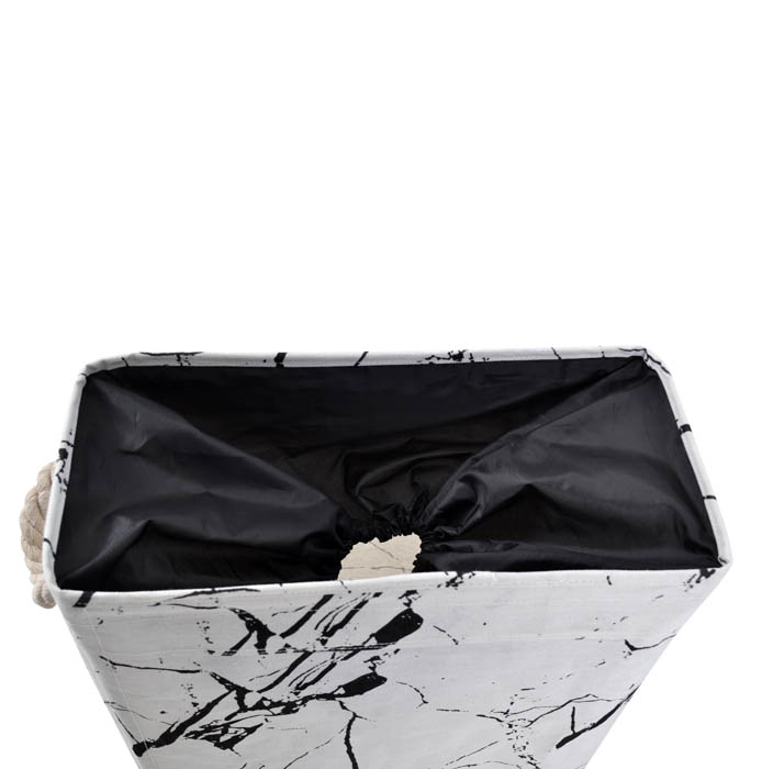 Καλάθι απλύτων υφασμάτινο σε άσπρο χρώμα με διακόσμηση εφέ μάρμαρου. Διαθέτει τέσσερα ροδάκια για εύκολη μεταφορά και είναι αναδιπλούμενο για εύκολη αποθήκευση. Κλείνει στην κορυφή με ύφασμα σουρώνοντας το κορδόνι και έχει χωρητικότητα 40 λίτρα.