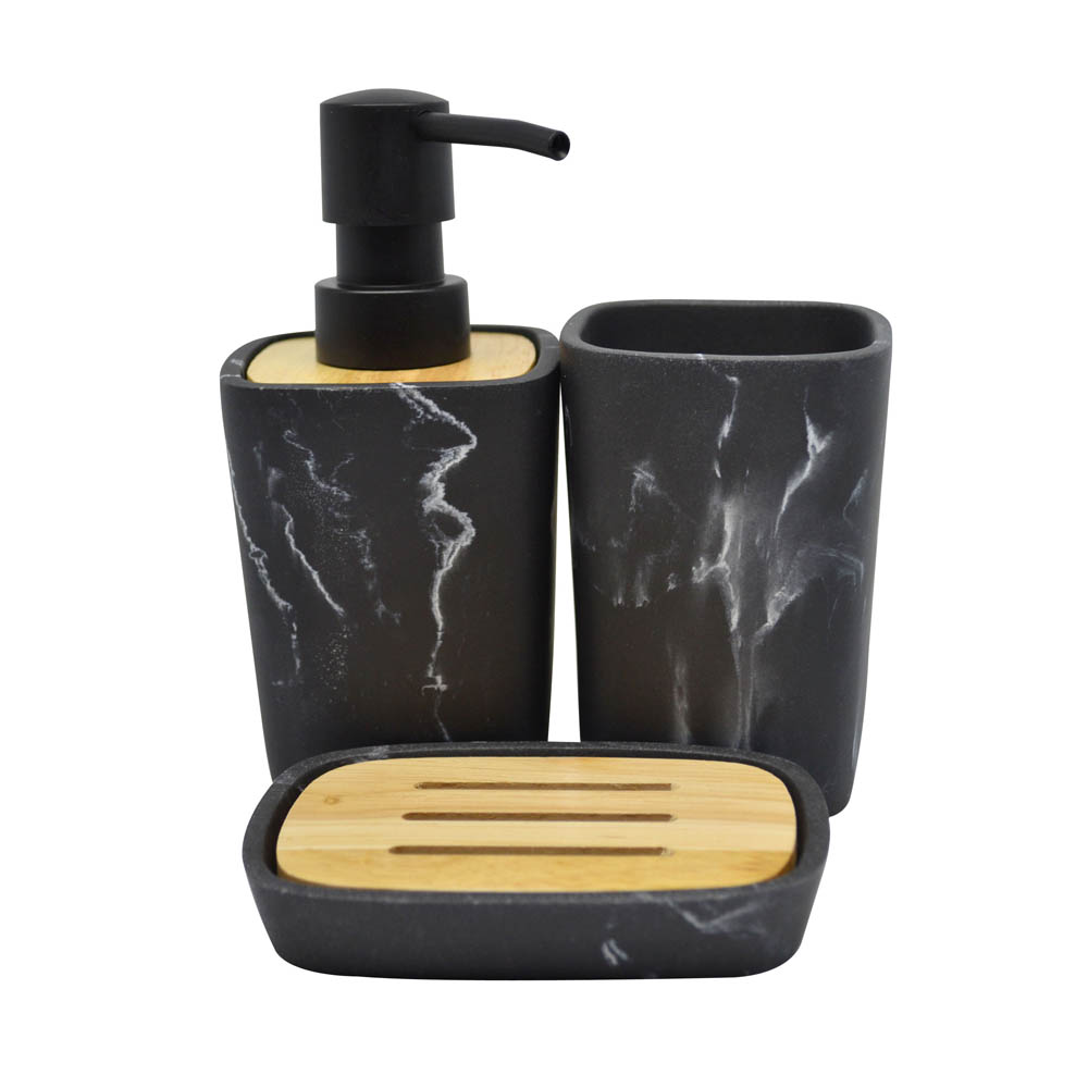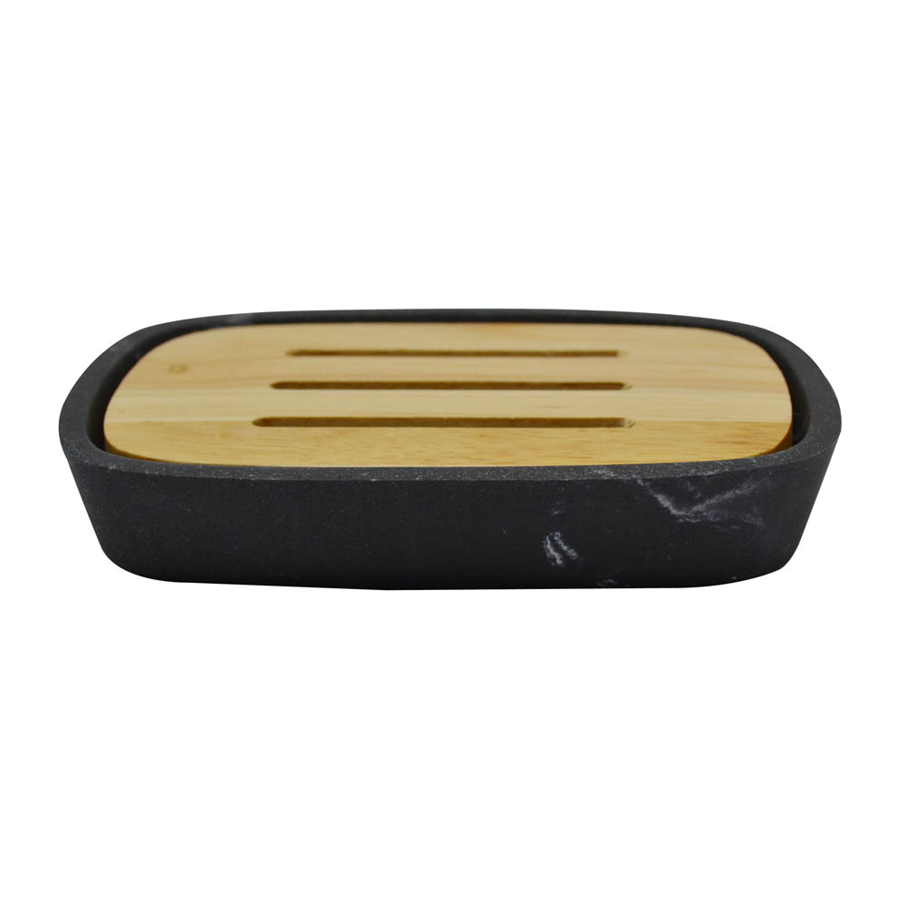 Σαπουνοθήκη πολυεστερική με διακόσμηση εφέ μαύρο μάρμαρο και ξύλο μπαμπού στο πάνω μέρος. Αξεσουάρ μπάνιου εξαιρετικής ποιότητας με μοντέρνο και κομψό σχεδιασμό. Συνδυάστε τα ιδανικά με αντικείμενα της υπόλοιπης σειράς.