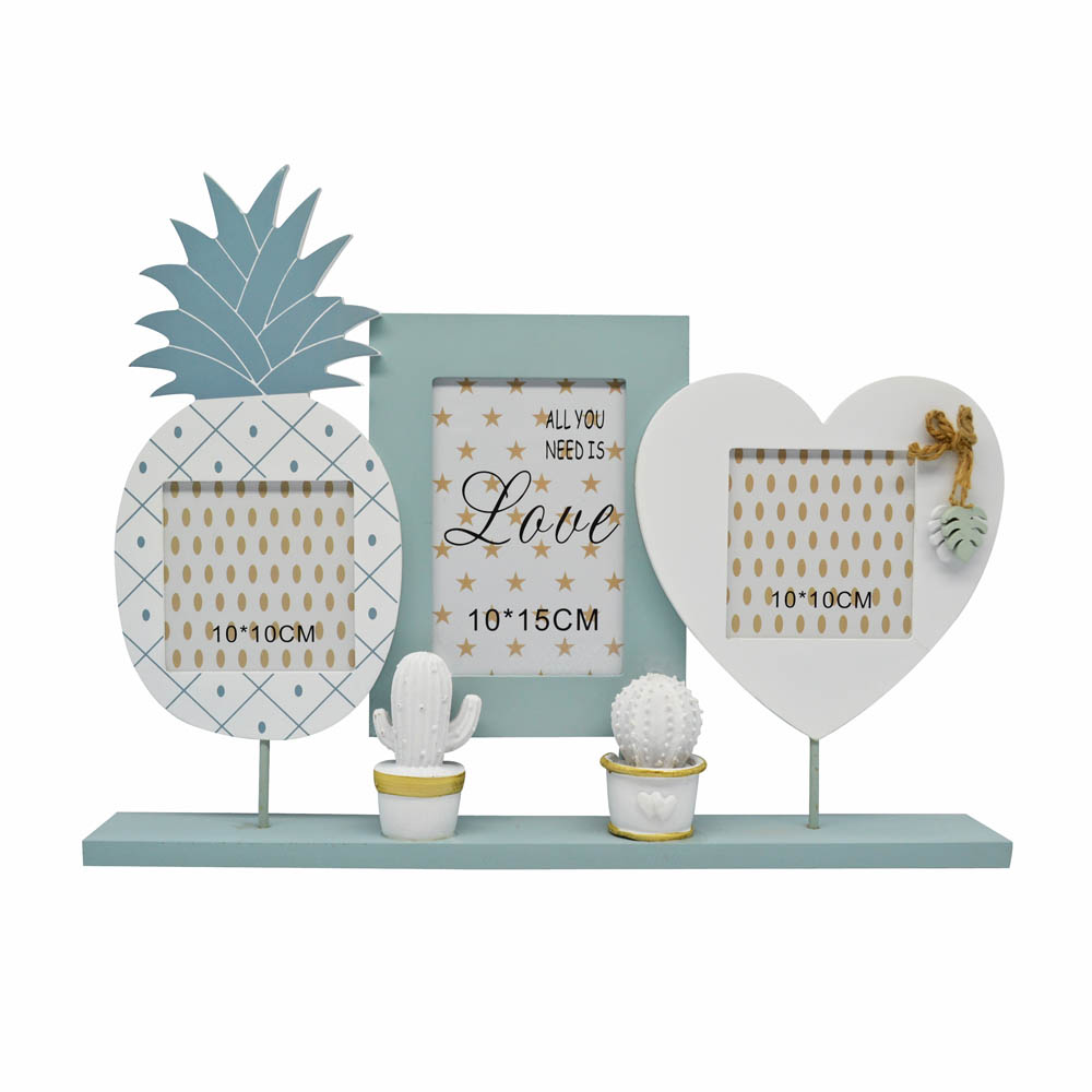 Κορνίζα ξύλινη τριών θέσεων, σε σχήμα ανανά 10x10εκ., ορθογώνιο 10x15εκ. και καρδιάς 10x10εκ., σε λευκό και μπλε ραφ χρώμα με διακόσμηση κάκτους . Δώστε μια άλλη νότα στο προσωπικό σας χώρο κρατώντας ζωντανές τις αναμνήσεις και τις πιο όμορφες στιγμές σας