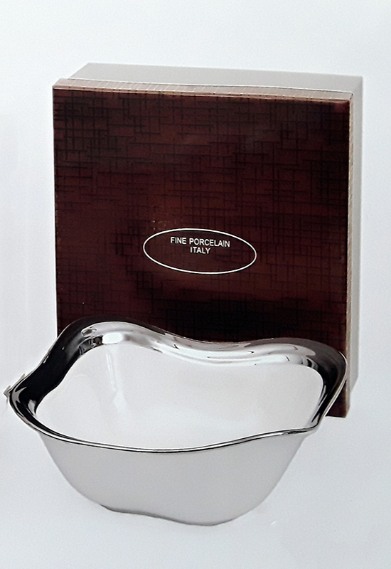 Μπολ κυματιστό από λεία πορσελάνη διακοσμημένο περιμετρικά με ασημί τρέσα. Διατίθεται σε πολυτελή συσκευασία δώρου.