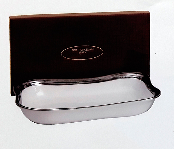 Πιατέλα ορθογώνια βαθιά από λευκή λεία πορσελάνη διακοσμημένη περιμετρικά με ασημί τρέσα, σε πολυτελή συσκευασία δώρου.