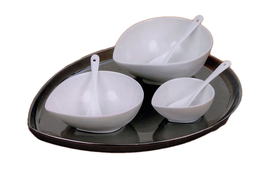 Άριστης ποιότητας λευκή πορσελάνης ορντεβιέρα 3 θέσεων με κουταλάκια σερβιρίσματος, σε κεραμικό ασημί δίσκο.