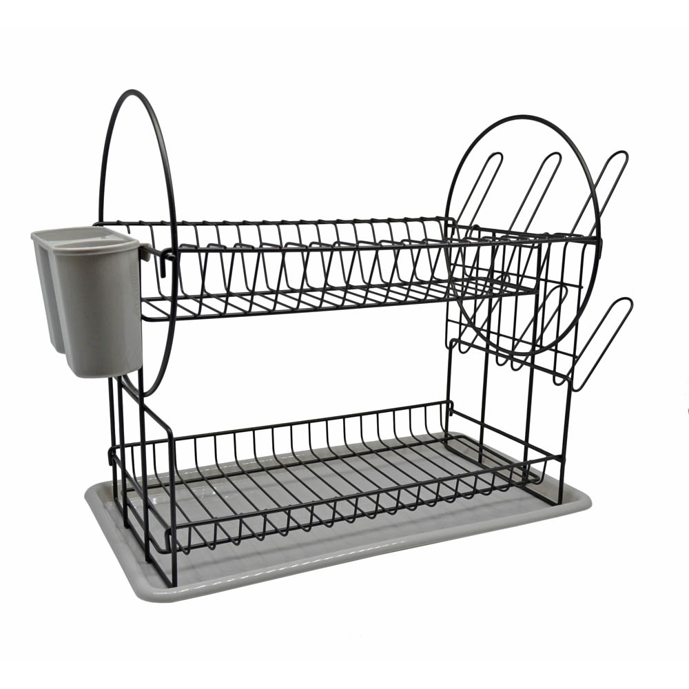 Πιατοθήκη διώροφη μεταλλική μαύρη, η οποία διαθέτει πλαστικό δίσκο και κουταλοθήκη σε γκρι χρώμα. Το στόμιο αποστράγγισης εμποδίζει τη συγκέντρωση νερού μέσα στο δίσκο.Πλένεται και καθαρίζεται εύκολα.. Χρηστικά αντικείμενα για την κουζίνα σας, κομψά και μοντέρνα καθημερινής χρήσης σε λιτές γραμμές. Συνδυάστε τα με τα υπόλοιπα αντικείμενα της σειράς και ανανεώστε τον χώρο σας.