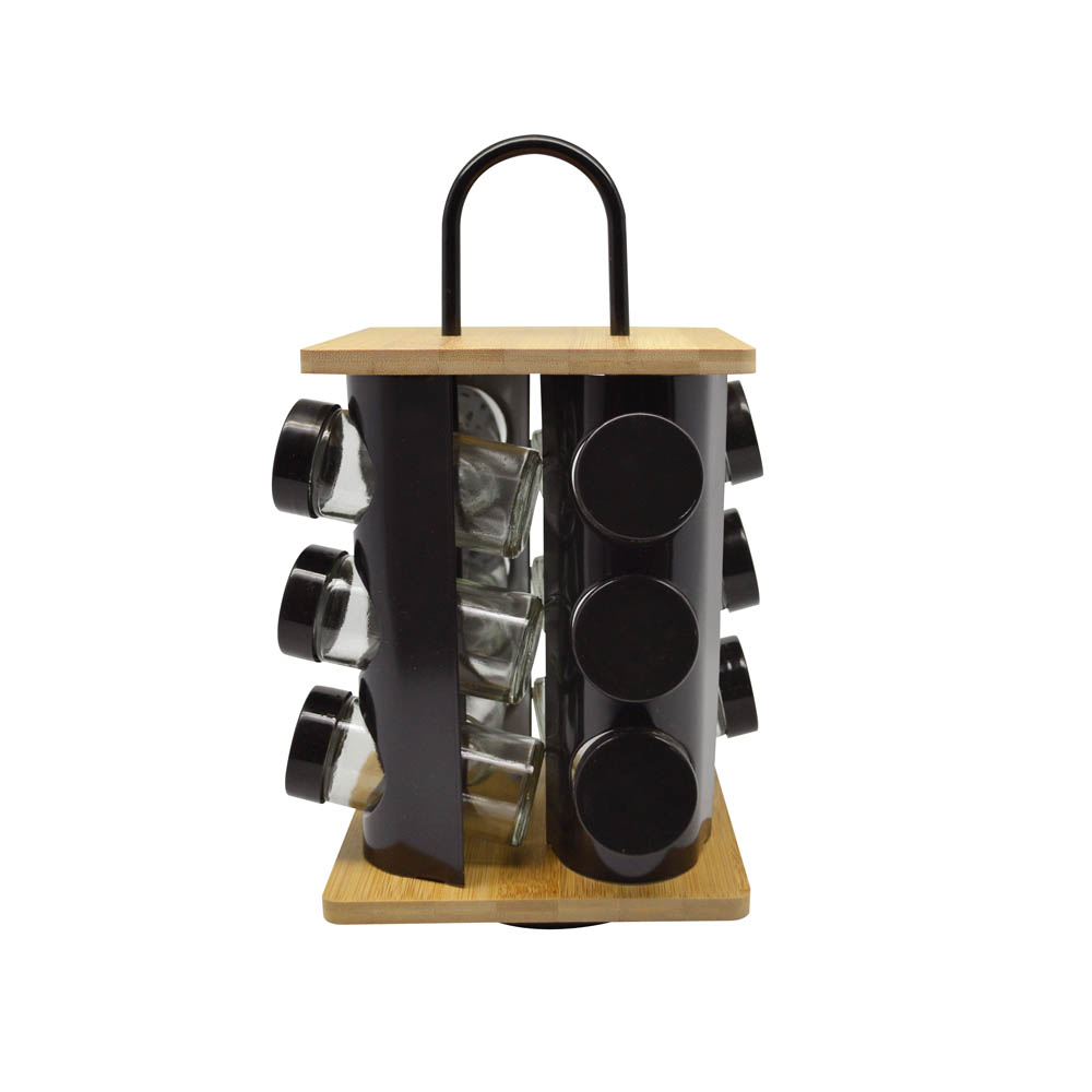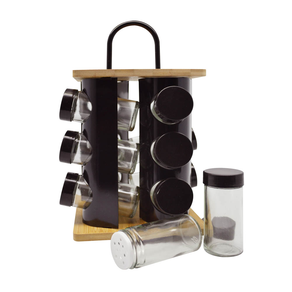 Βάση από ξύλο μπαμπού περιστρεφόμενη, η οποία διαθέτει δώδεκα γυάλινα βαζάκια με μαύρο μεταλλικό κούμπωμα, κατάλληλα για αποθήκευση μπαχαρικών.. Χρηστικά αντικείμενα με μοντέρνο και κομψό σχεδιασμό απαραίτητα για κάθε κουζίνα. Οργανώστε τον χώρο σας διαλέγοντας ανάμεσα από την μεγάλη ποικιλία της σειράς μας!