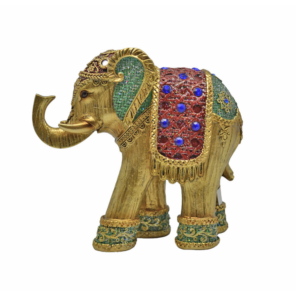 Διακοσμητικός ελέφαντας πολυεστερικός σε χρυσό χρώμα με πετρόλ και κόκκινες λεπτομέρειες, μπλε χάντρες σε έθνικ στυλ. Ξεχωριστά αντικείμενα για να στολίσετε το σπίτι σας ή να τα προσφέρετε σαν δώρο στα αγαπημένα σας πρόσωπα