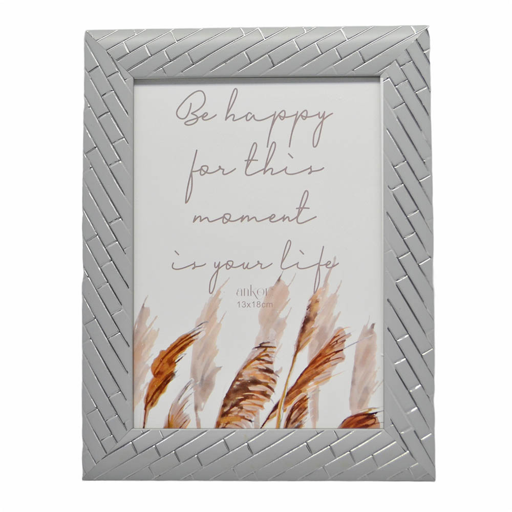 Κορνίζα πλαστική σε γκρι χρώμα με διακόσμηση ασημί γραμμές. Περιστρέφεται δίνοντας τη δυνατότητα τοποθέτησης οριζόντιας ή κάθετης φωτογραφίας κ κρεμιέται στον τοίχο