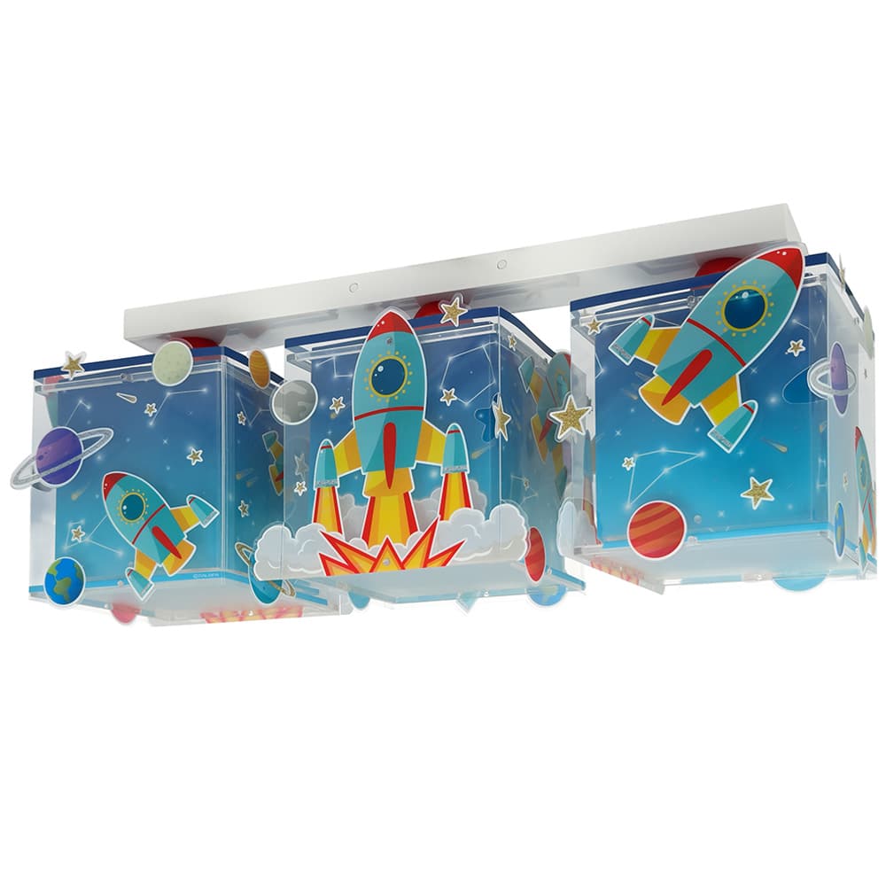 Τρίφωτο παιδικό φωτιστικό οροφής σε διάταξη ράγας κατάλληλο για γενικό φωτισμό και θέμα τους πυραύλους στο διάστημα. Το Rocket τρίφωτο οροφής ράγας είναι κατασκευασμένο με διάφανα καπέλα διπλού τοιχώματος από άκαυστο λεπτό πολυπροπυλένιο και φωσφορίζοντα στο σκοτάδι εξωτερικά μέρη. Κιτ ανάρτησης σε σχήμα ράγας και εύκολο τρόπο στήριξης click & go. Τύπος ντουί E27 με θέσεις για τρεις λαμπτήρες LED για άπλετο φως στο δωμάτιο. Παρέχονται 3 διαχυτές φωτός για τις μικρότερες ηλικίες προσφέροντας ομοιόμορφο φωτισμό αλλά και την προστασία των ματιών. Το Rocket τρίφωτο οροφής ράγας είναι κατασκευασμένο εξ ολοκλήρου στην Ευρώπη το και συμπληρώνει τα υπόλοιπα παιδικά φωτιστικά της συλλογής κομοδίνου, απλίκα ή νυκτός.