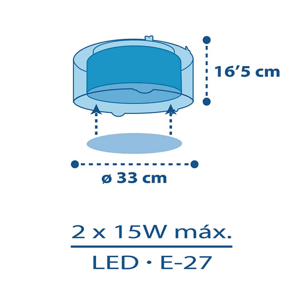 Παιδικό φωτιστικό οροφής τύπου πλαφονιέρα κατάλληλο για γενικό φωτισμό και όλες τις δραστηριότητες των παιδιών. Είναι διπλού τοιχώματος από άκαυστο λεπτό πολυπροπυλένιο και φωσφορίζοντα στο σκοτάδι εξωτερικά μέρη. Τοποθετείται εύκολα και γρήγορα και είναι εφοδιασμένο με δύο θέσεις λαμπτήρων LED για πραγματικά άπλετο φως στο δωμάτιο. Παρέχεται διαχυτής φωτός για τις μικρότερες ηλικίες που προσφέρει ομοιόμορφο φωτισμό αλλά και προστασία. Κατασκευασμένο εξ ολοκλήρου στην Ευρώπη το Planets πλαφονιέρα οροφής, συμπληρώνει τα υπόλοιπα παιδικά φωτιστικά της συλλογής κομοδίνου, απλίκα ή νυκτός.