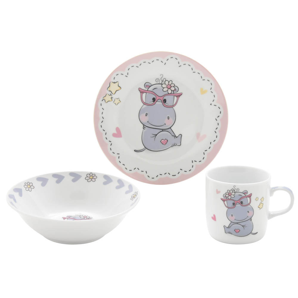 Σετ φαγητού 3 τεμαχίων από ποιοτική πορσελάνη με σχέδιο ιπποποταμάκι και σε συσκευασία δώρου. Το σετ περιλαμβάνει ένα πιάτο 17,5εκ.,ένα μπολ 15x6εκ. & μία κούπα χωρητικότητας 230ml. Είναι κατάλληλο για πλυντήριο πιάτων και φούρνο μικροκυμάτων.. Η ώρα του φαγητού γίνεται πιο διασκεδαστική για τους μικρούς μας φίλους!