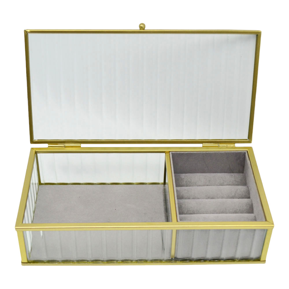 Κουτί αποθήκευσης κατασκευασμένο από διάφανο γυαλί και χρυσό μεταλλικό πλαίσιο. Είναι ιδανικό για την οργάνωση και προβολή κοσμημάτων, όπως δαχτυλίδια, σκουλαρίκια, βραχιόλια και κολιέ.