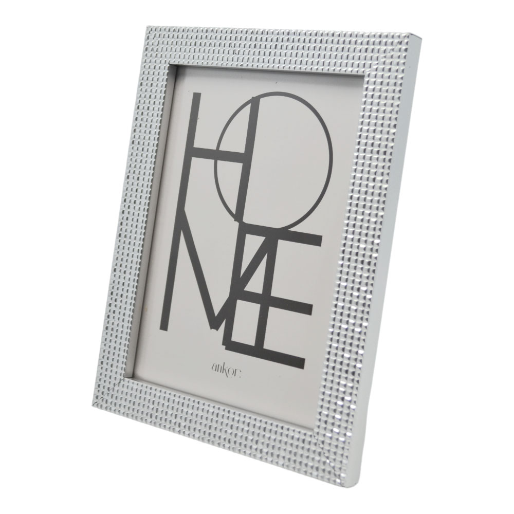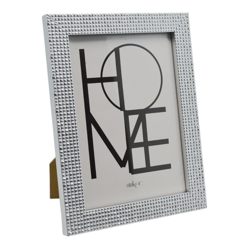 Κορνίζα πλαστική σε ασημί χρώμα με ανάγλυφη διακόσμηση. Περιστρέφεται δίνοντας τη δυνατότητα τοποθέτησης οριζόντιας ή κάθετης φωτογραφίας και κρεμιέται στον τοίχο.