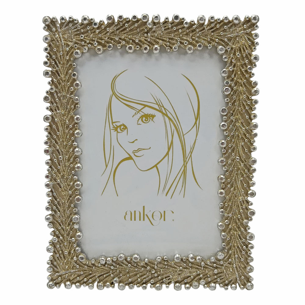 Κορνίζα πολυεστερική με εκλεπτυσμένο σχέδιό, διακοσμημένο με λαμπερές χρυσές και ασημένιες λεπτομέρειες. Το περίγραμμά της αποτελείται από ανάγλυφα, φυλλοειδή μοτίβα και ασημένιες πέτρες, δημιουργώντας ένα κομψό στυλ που προσθέτει λάμψη σε κάθε χώρο.