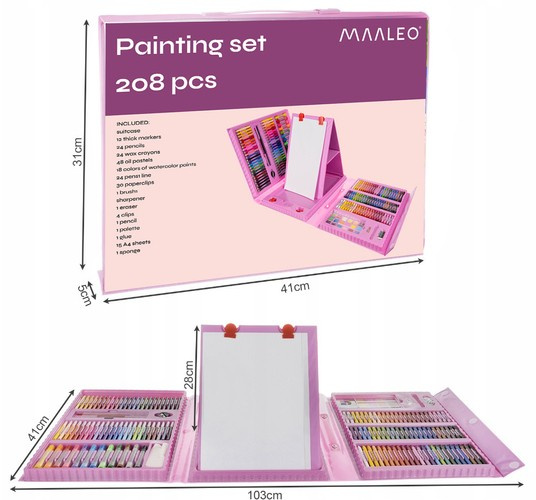 XXL PAINTING SET IN A CASE WITH 208 PIECES PRACTICAL SUITCASE – the children's art set has a practical suitcase with inserts, which is equipped with a 3-velcro closure and a comfortable handle. Thanks to this transporting the suitcase is comfortable and very easy, and the contents do not spill out. Set It is perfect for going to school, kindergarten, outdoors or to a friend's house. G IGANT SET - painting set in a suitcase It consists of 208 elements , including: a case, 12 thick markers, 24 pencil crayons, 24 wax crayons, 48 oil pastels, 18 colors of watercolor paints, 24 markers, 1 ruler, 35 paper clips, 1 brush, 1 sharpener, eraser, 4 clips, 1 pencil, 1 palette, 10 A4 sheets, 1 sponge. EASY ACCESS TO INDIVIDUAL ELEMENTS - painting kit has special compartments that allow quick and easy access to individual elements , while ensuring their protection and keeping them organized. BUILT-IN DOUBLE-SIDED ORGANIZER FOR PAINTING A4 - Two children can use the drawing area at the same time, just spread the suitcase on the table and sit the children opposite each other. SPECIFICATION - color: pink; material: plastic; number of elements in the set: 208pcs; dimensions of the folded suitcase: 31/41/5cm; dimensions of the unfolded one: 41/103/28cm; weight of the set: 1.396 kg; weight of the set in the packaging: 1.413 kg SPECIFICATION color: pink material: plastic number of elements in the set: 208 pcs dimensions of the folded suitcase: 31/41/5 cm dimensions when unfolded: 41/103/28 cm set weight: 1.396 kg weight of the set in the package: 1.413 kg INCLUDED suitcase 12 thick markers 24 pencil crayons 24 wax crayons 48 oil pastels 18 colors of watercolor paints 24 pens 1 line 35 paper clips 1 brush 1 sharpener 1 eraser 4 clips 1 pencil 1 pallet 10 sheets of A4 1 sponge drawing stand
