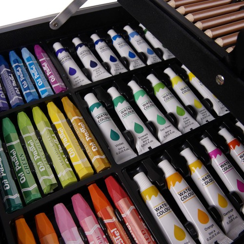 colored pencils 28 pcs. markers 33 pcs. oil pastels 24 pcs. watercolor paints 24 pcs. acrylic paints 24 pcs. erasers 2 pcs. paint mixing palettes 2 pcs. pencils 2 pcs. brushes 4 pcs sharpener 1 pc suitcase 1 pc